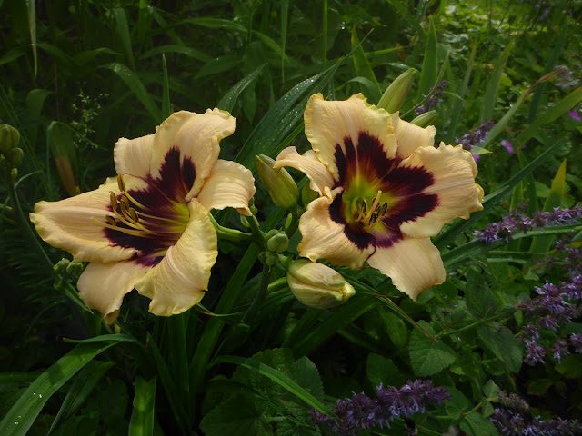 Lavatera/Mamelukærmebusk står lige ved siden af træet med clematis Beauty of Worcester, de klæder hinanden så fint.